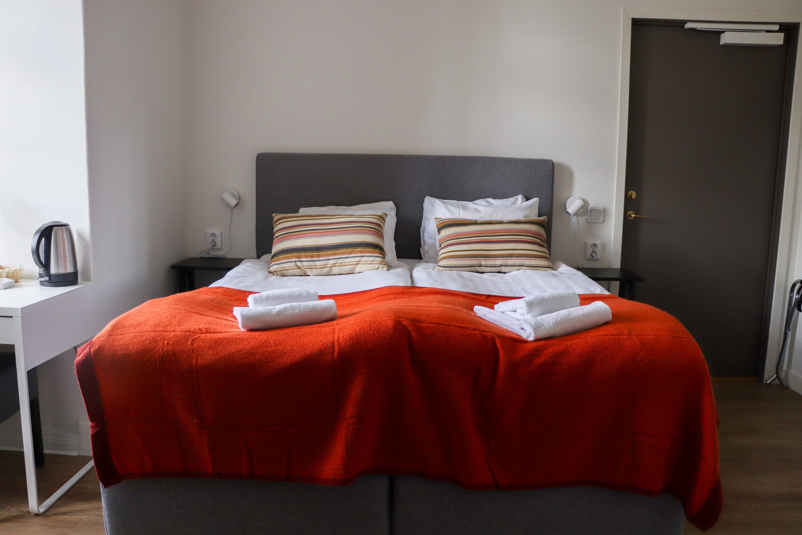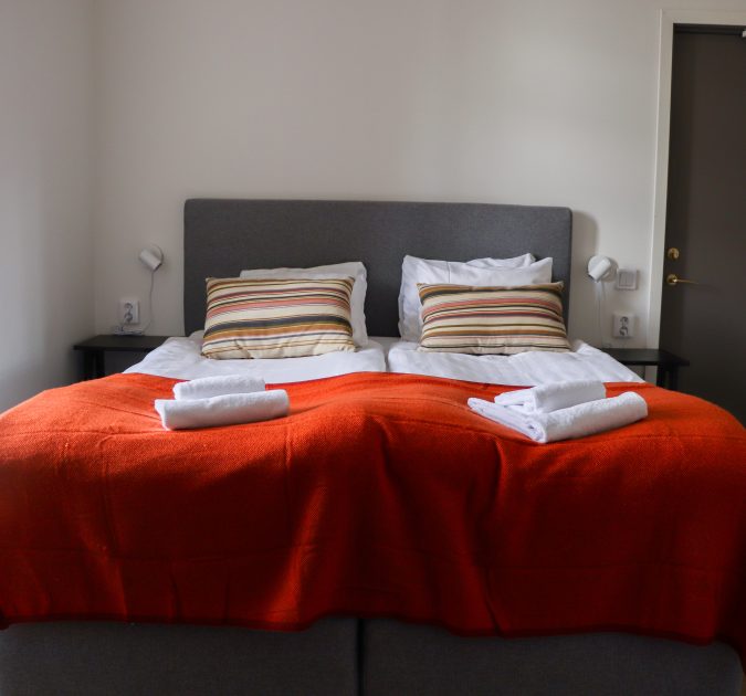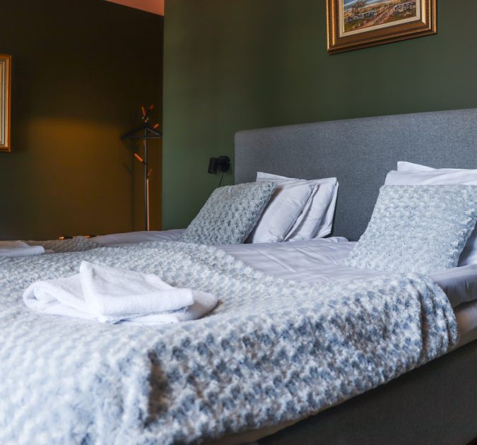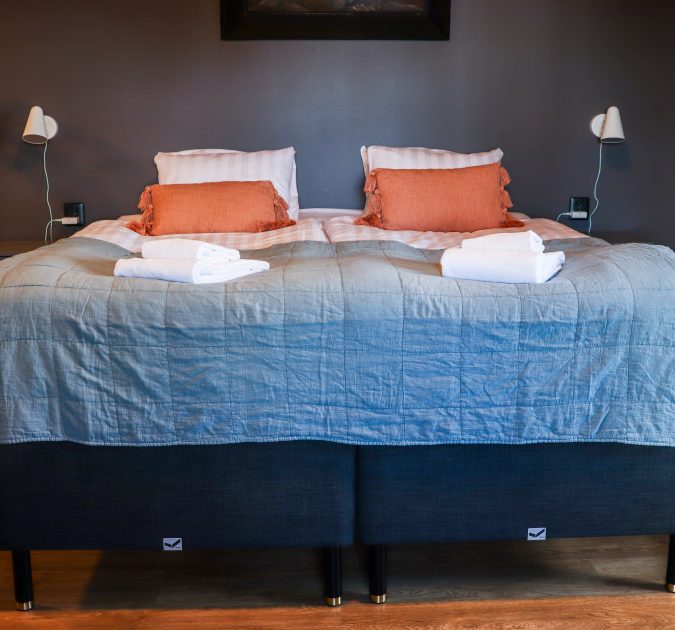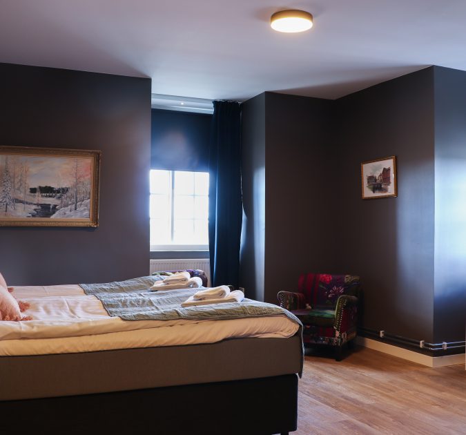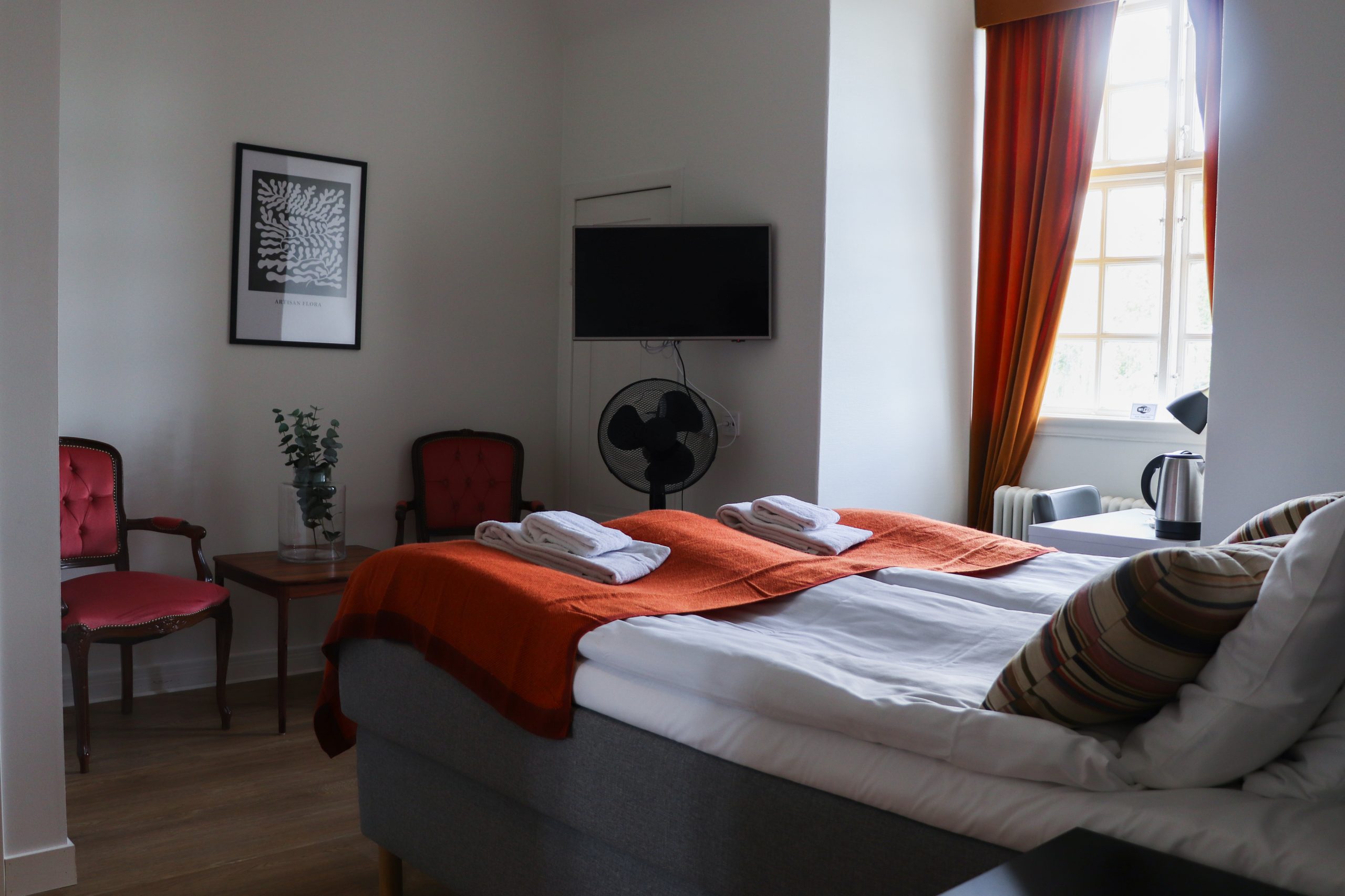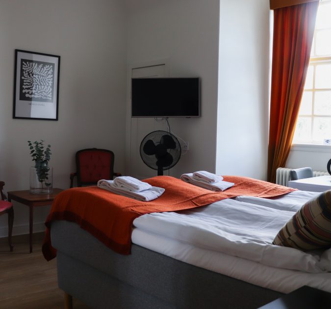 Våra rymligaste dubbelrum med närproducerade kontinentalsängar från Viking Beds i Landsbro, TV, trådlöst internet, helkaklad toalett med badkar/dusch, skrivplats, mini kyl, vattenkokare med te & kaffe och hårtork. Fönster mot torget eller parken.